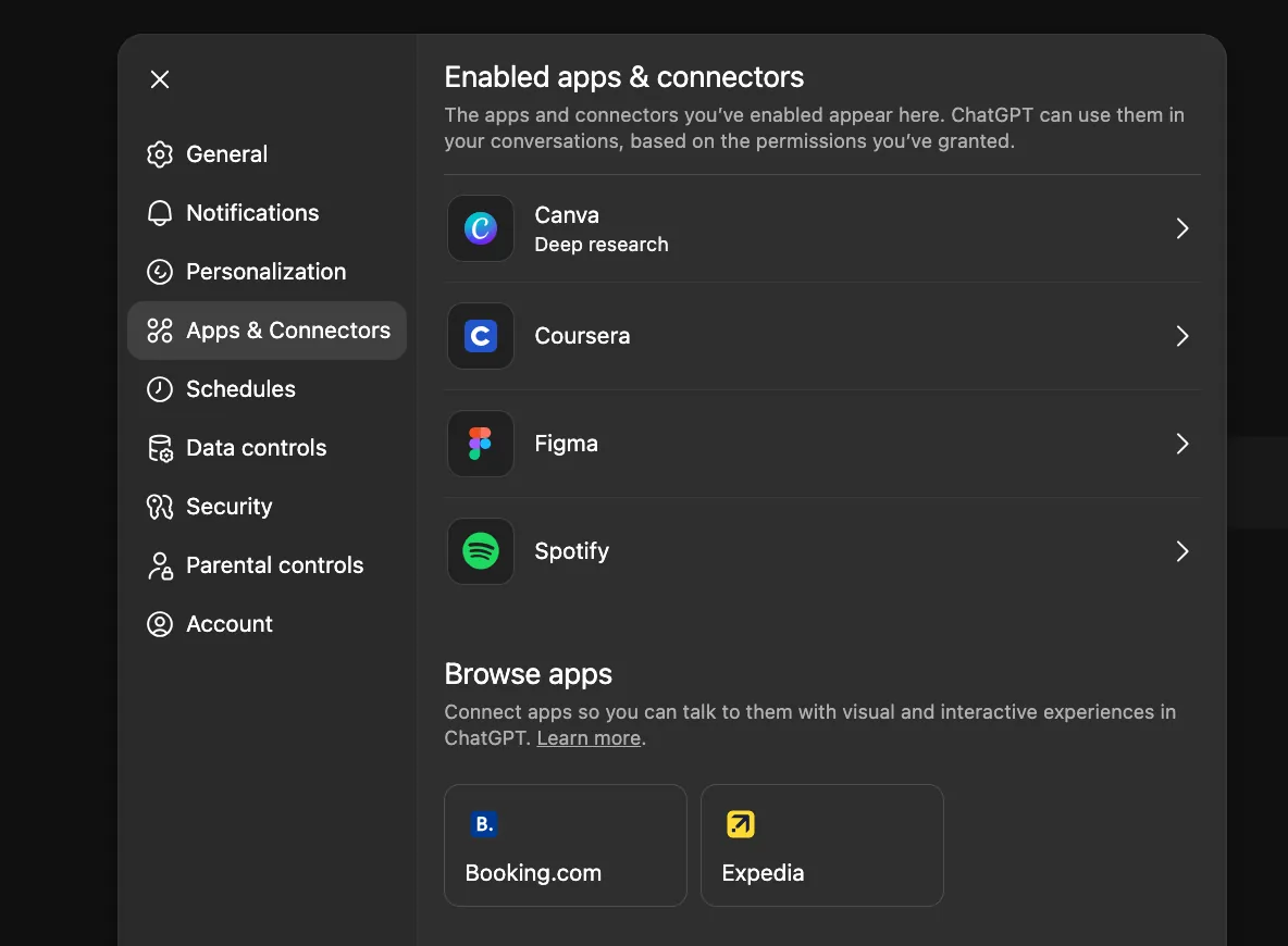 Połączenie kont jest prostsze, niż mogłoby się wydawać. Wystarczy zalogować się do ChatGPT, wpisać nazwę aplikacji na początku zapytania, a chatbot sam przeprowadzi przez proces autoryzacji. Można też skonfigurować wszystko naraz – w ustawieniach, w sekcji „Apps and Connectors”, gdzie widać pełną listę dostępnych integracji.