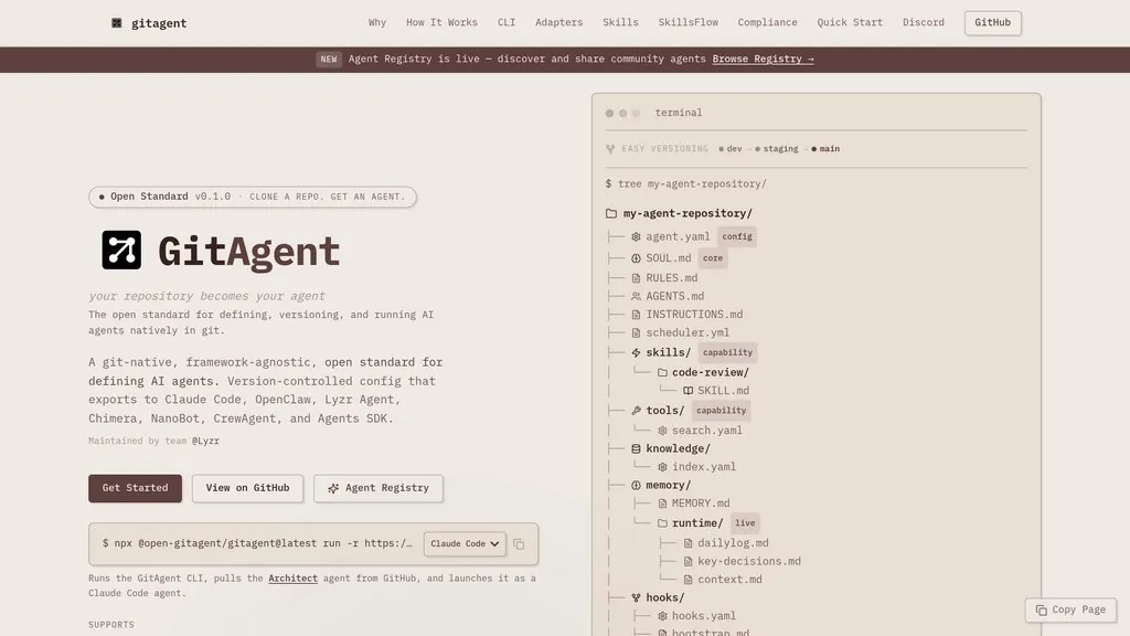 GitAgent robi coś, czego nikt wcześniej nie połączył w ten sposób: używa Gita jako warstwy nadzoru nad zachowaniem agenta. Każda zmiana wewnętrznego stanu agenta, aktualizacja pamięci, przyswojenie nowej umiejętności, traktowana jest jak zmiana kodu. System może skonfigurować tworzenie nowej gałęzi i Pull Requesta, gdy agent modyfikuje swój context.md lub SOUL.md.