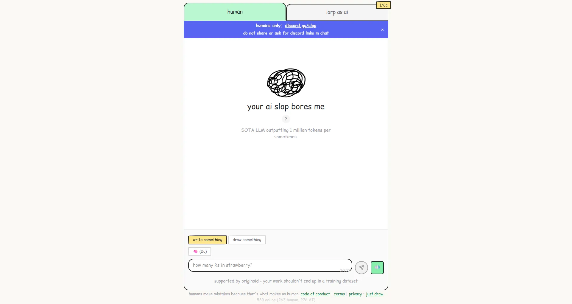 Interfejs celowo nawiązuje do estetyki późnych lat 90. – Comic Sans, prosta grafika, zero designerskich fajerwerków. I właśnie to działa. Użytkownicy mają 75 sekund na odpowiedź, więc rysunki tworzone myszką wyglądają tak, jak wyglądają – niedoskonale, nieregularnie, po ludzku.